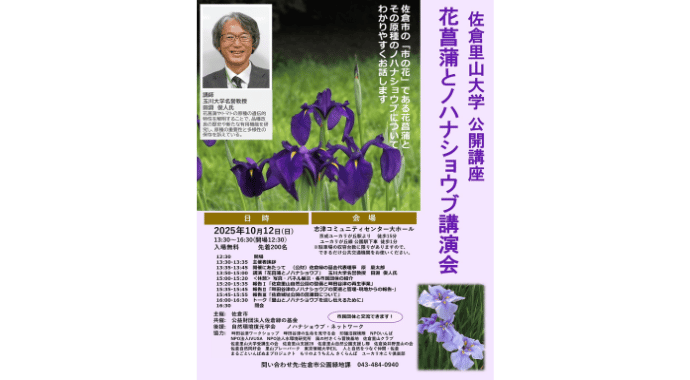 自然と植物を愛するあなたへ。佐倉市の市の花「花菖蒲」と、希少な「ノハナショウブ」について深く学べる講演会が開催されます。講師は植物の遺伝研究の第一人者である田淵俊人氏。花菖蒲・ノハナショウブの魅力や重要性を知ることができるほか、佐倉の里山保全活動の報告、展示、トークなど盛りだくさんの内容です。自然を未来へ繋ぐ一歩として、ぜひご参加ください。