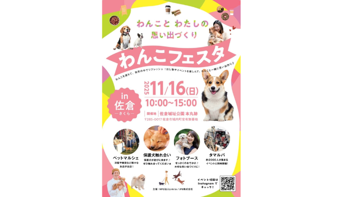 千葉県佐倉城址公園で、わんこ向けの初の大型イベント「わんこフェスタin佐倉」が11/16(日)に開催決定!ペットマルシェから保護犬触れ合い体験まで、わんことともに楽しめる1日をお届けします。