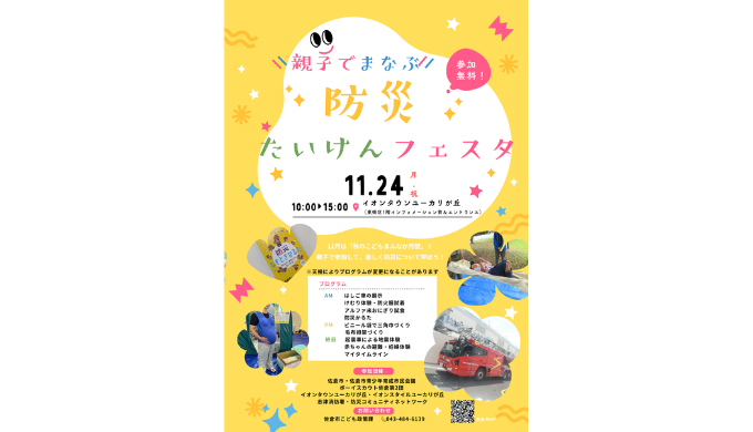 このイベントは、国の「秋のこどもまんなか月間」(こども家庭庁)の一環として、「子どもの防災」をテーマに地域全体で子育て世帯を支える機運を盛り上げるために開催されています。