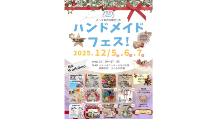 ハンドメイド好きはもちろん、特別なプレゼントを探している方や新しい体験を楽しみたい方にぴったりのイベントです。12月5日はイオンタウンユーカリが丘西街区1Fさくらの広場で、心温まるハンドメイドの世界を堪能してください。