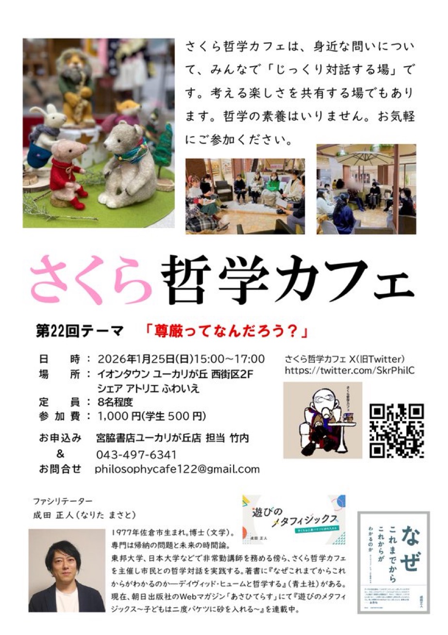 2026年1月25日 日曜日、千葉県佐倉市ユーカリが丘にて第22回さくら哲学カフェが開催されます。主催は市民向け哲学対話の実践で知られる竹内光則氏。会場はイオンタウンユーカリが丘西街区2階にあるシェアアトリエふわいえで、地域の方が気軽に集える落ち着いた空間です。